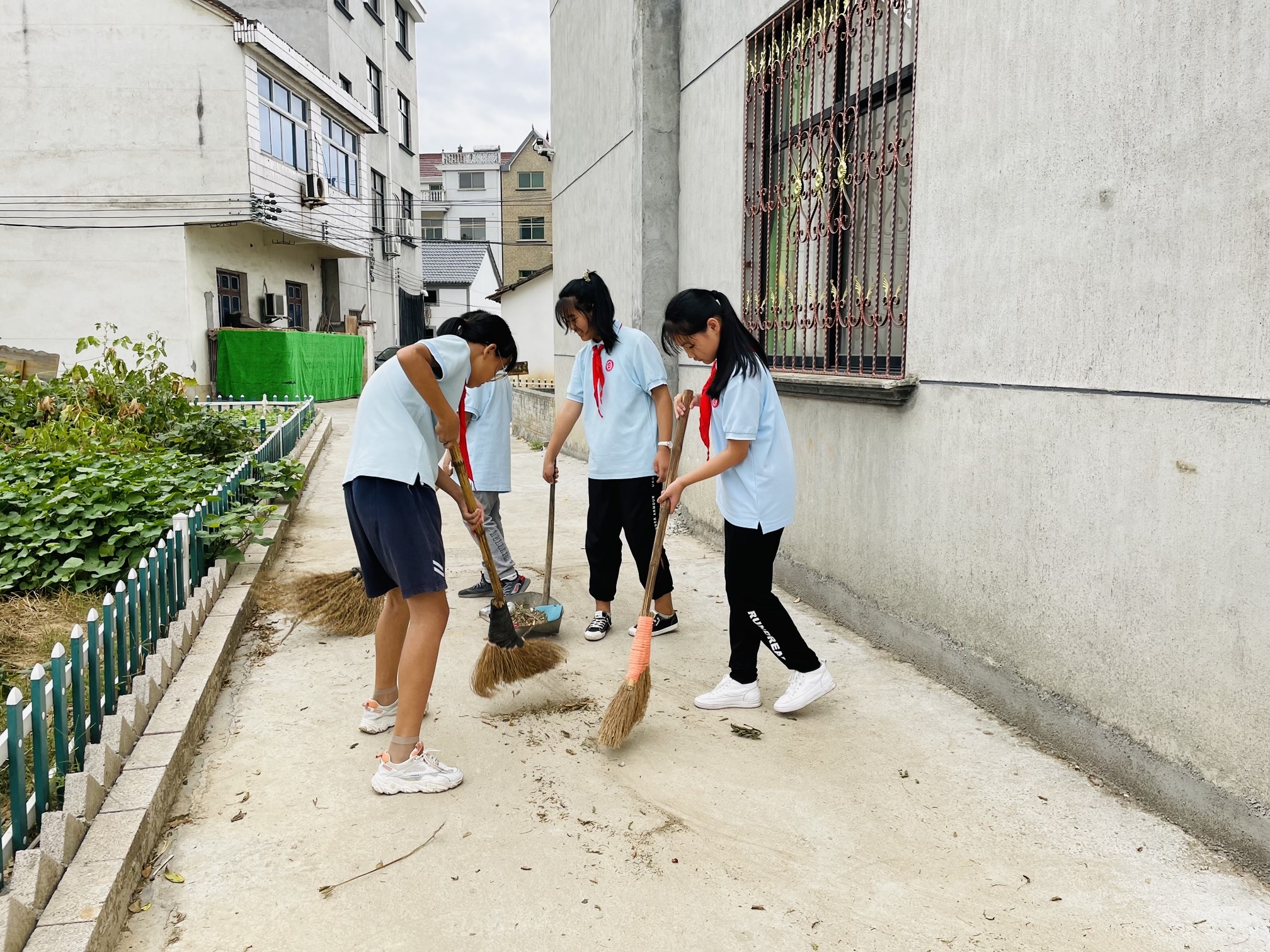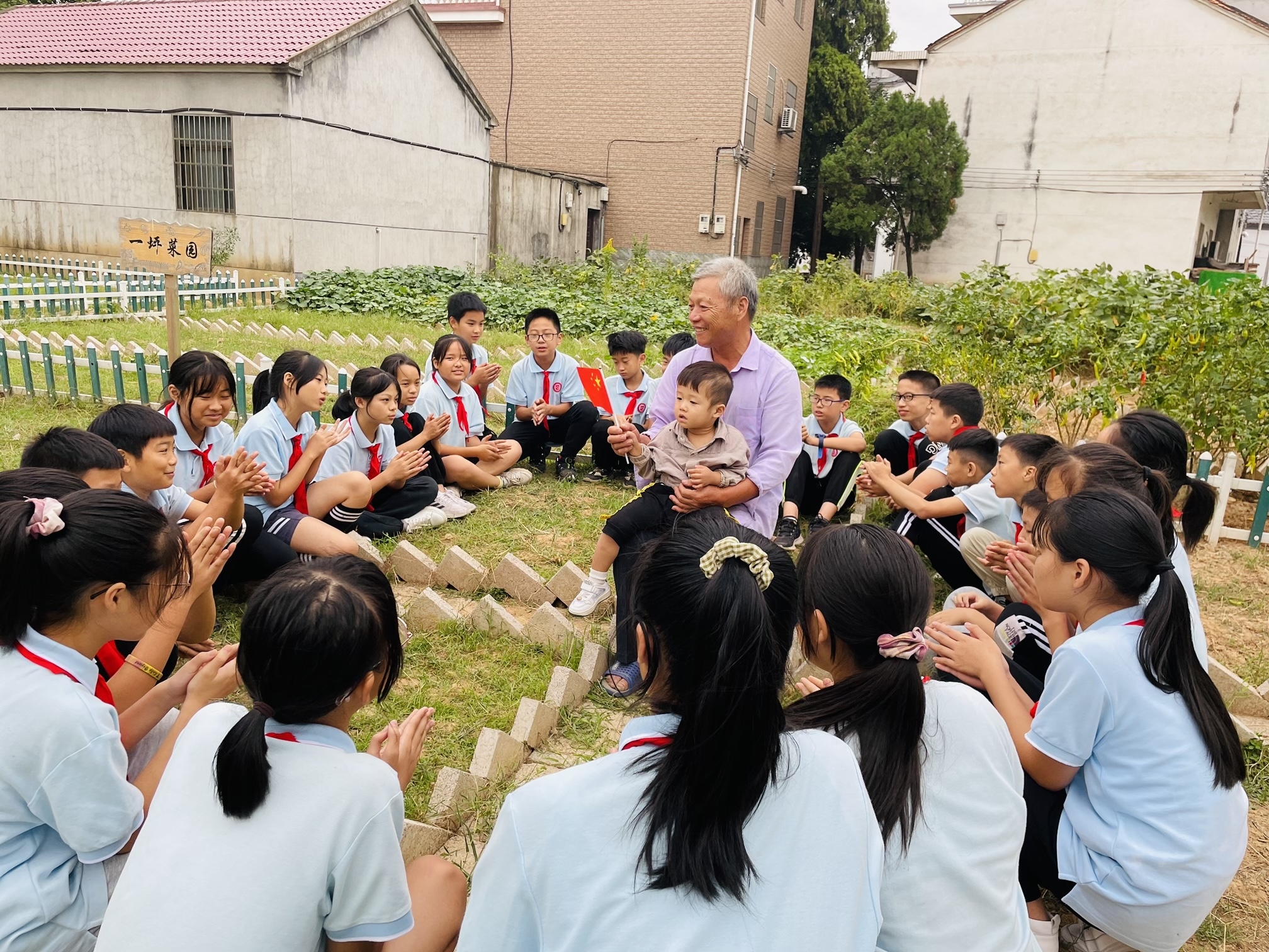 菜园里,孩子们如火如荼地除起杂草,还有几个孩子打扫门前卫生。看着平整的菜地和干净的院落,陈爷爷露出了开心的笑容。随后,孩子们还为陈爷爷带来了朗诵、武术表演等节目。