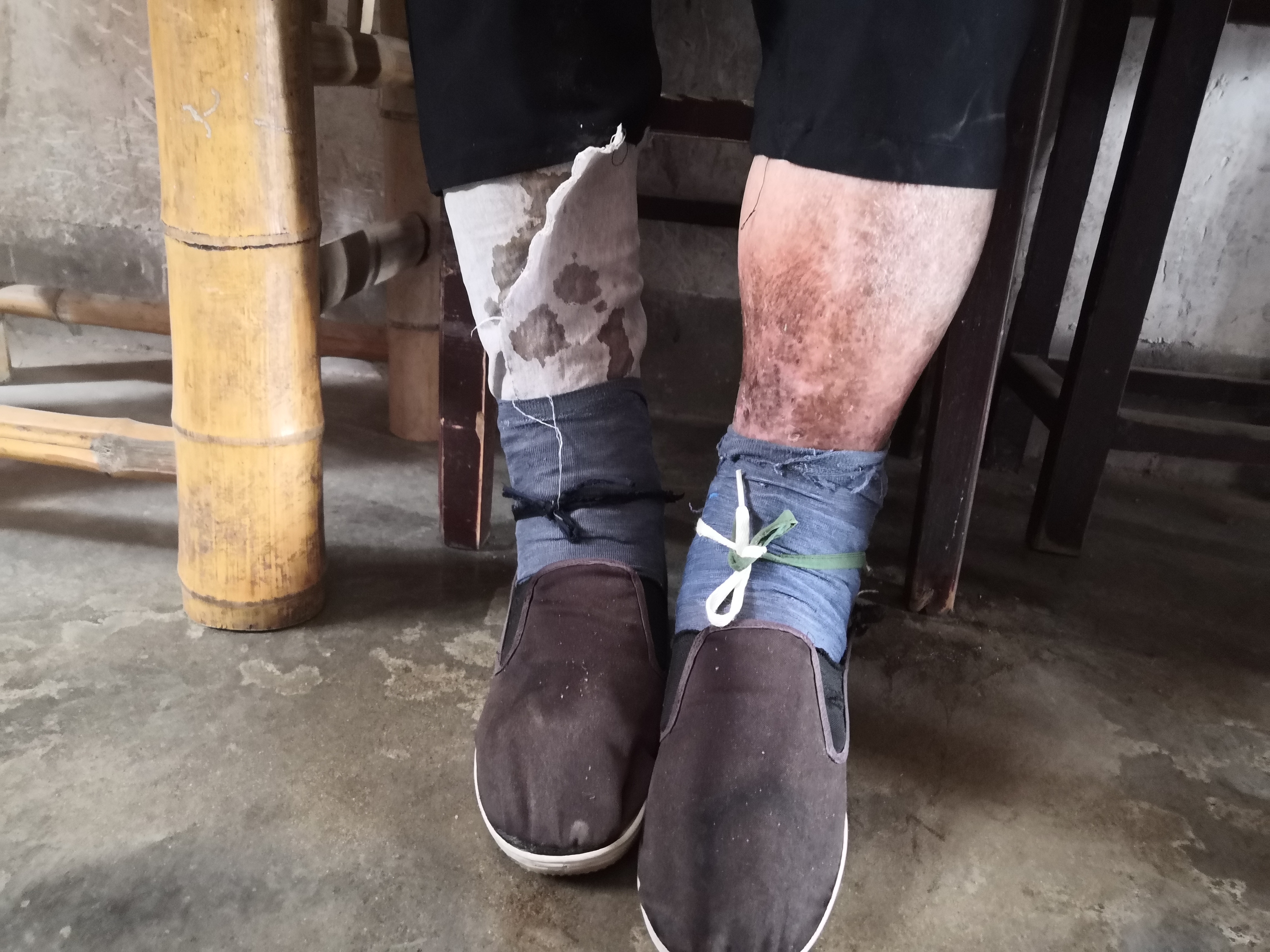 李志发老人就端坐在桌子边,虽然一直没说话,但神志还算清醒,一看到志愿者们来了,就露出了微笑。他脚上穿着布鞋,两条小腿肿胀,右腿还包着纱布,时不时有脓水渗出来,左腿皮肤上能看到形成来一片很明显的木头似的癞癍。
