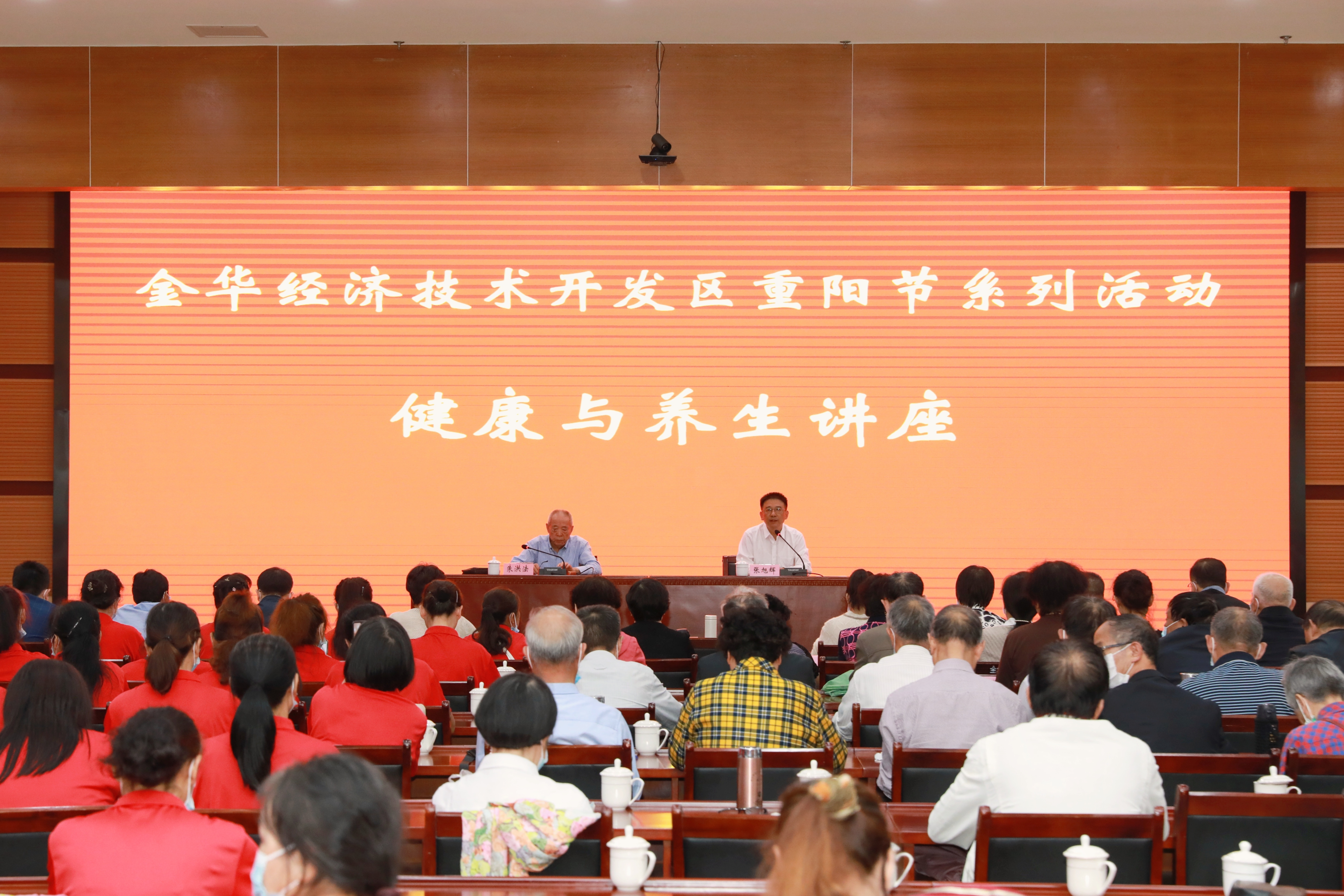 10月16日,金华开发区开展重阳节系列活动,邀请原市人大常委会主任朱洪法为开发区老干部、老同志上健康与养生讲座。金华开发区党工委书记张旭辉主持会议并感谢老同志们对开发区建设发展的付出与支持,祝愿老同志生活愉快、身体健康、万事如意。开发区党工委委员、组织人力社保局局长蔡于群参加。