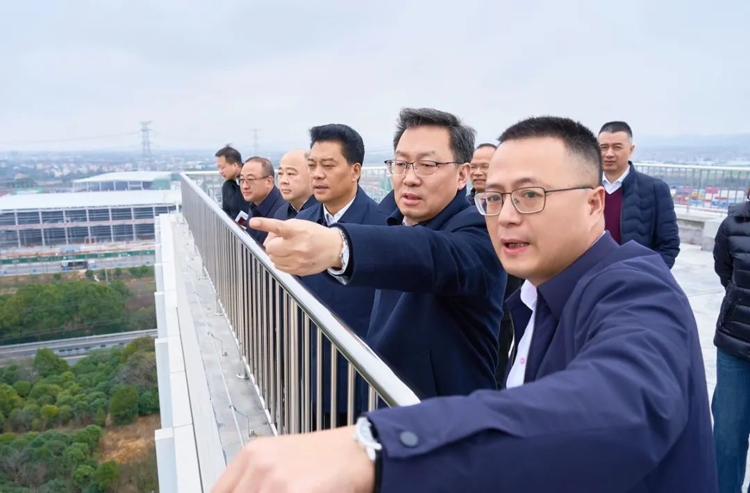 当前,华东国际联运港建设初具规模。港区内的普洛斯国际物流园已投入使用,为入驻企业提供大宗商品交易、国际采购、供应链管理等服务。在华东国际联运港港务中心顶楼,朱重烈俯瞰各重点功能区块,听取港区规划建设情况介绍。他指出,要坚持以港带产、以产兴城、港城融合,科学编制港区整体规划,完善开发架构,发挥政府性投资“四两拨千斤”撬动作用,大力引入社会资本和央企等开展合作,健全集疏运体系,积极依托国际陆港招引高端制造业项目,加强公共配套设施建设,全面推进港产城高质量融合发展。