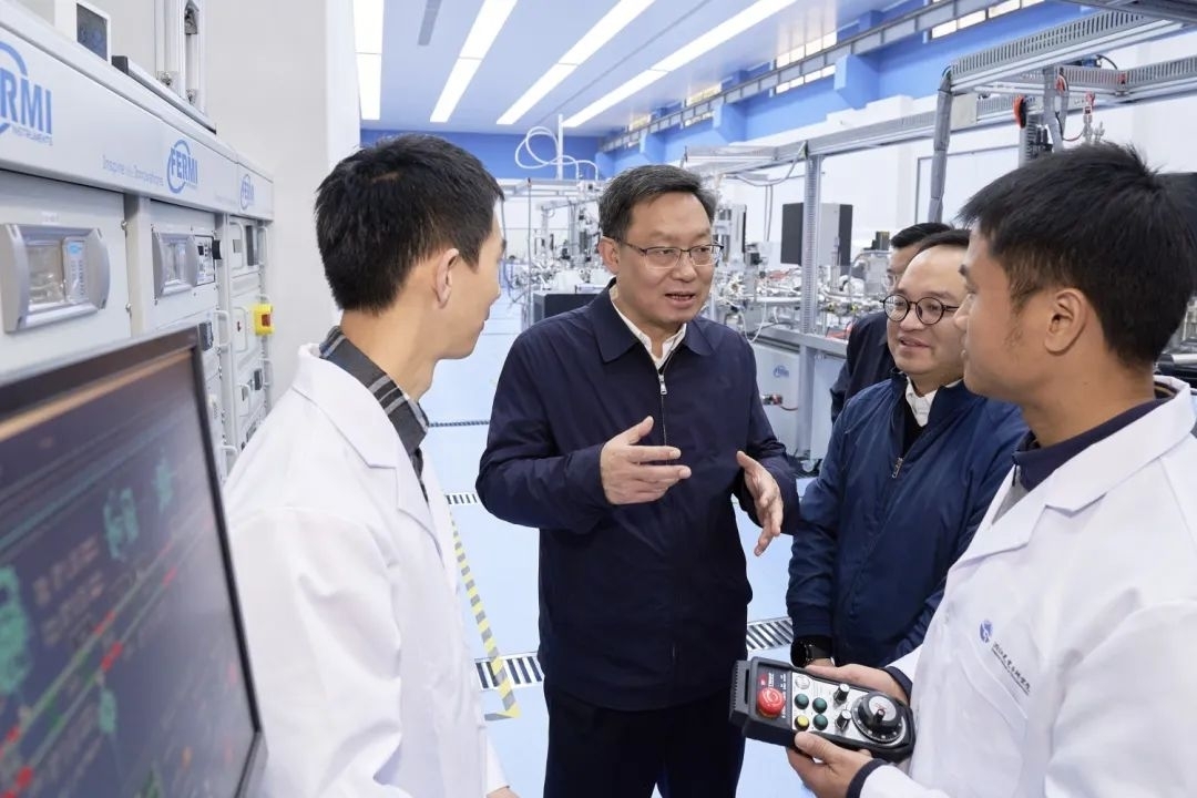 浙江光电子研究院是师大创新城的重大科创平台之一。在真空互联实验室内,科研人员正在制备新型半导体元器件。朱重烈察看科学装置,与科研人员深入交流,详细了解产业光源建设情况。据介绍,浙江光电子研究院成立一年多来,引进专业人才近百人,与省内外数十家上市公司等对接,开展产业光源需求调研。朱重烈鼓励浙江光电子研究院“看准了就抓紧干”,精准对接企业需求,加快建成现代产业光源大科学装置。他要求,属地和相关部门要充分用好浙江师范大学资源,大力推进师大创新城建设,进一步深化校地合作,系统谋划未来产业发展,不断放大集聚裂变效应。
