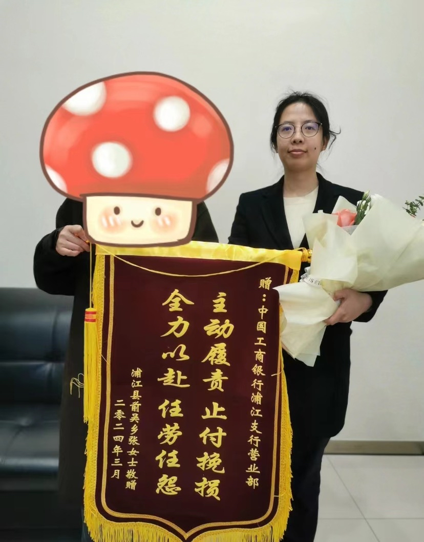 3月14日,客户张女士带着鲜花和锦旗来到工行金华浦江支行营业部,上书“主动履责 止付挽损 全力以赴 任劳任怨”十六个大字,以表达对大堂经理张格尔暖心服务的诚挚感谢。