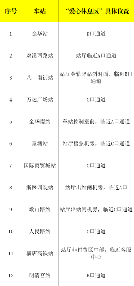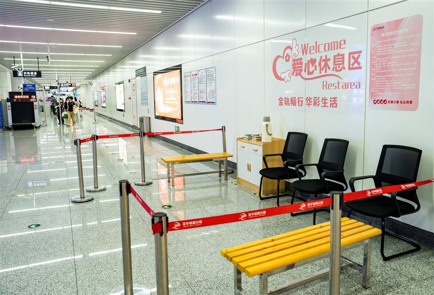 记者从金华市轨道交通了解到,为进一步提升服务品质,营造更舒适、更温馨的乘车环境,金华轨道交通对全线地下车站原有的纳凉区进行了全面升级改造,打造为常态化的“爱心休息区”。昨天下午,在金华站、八一南街站的爱心休息区里,有不少市民前来纳凉、休息。
