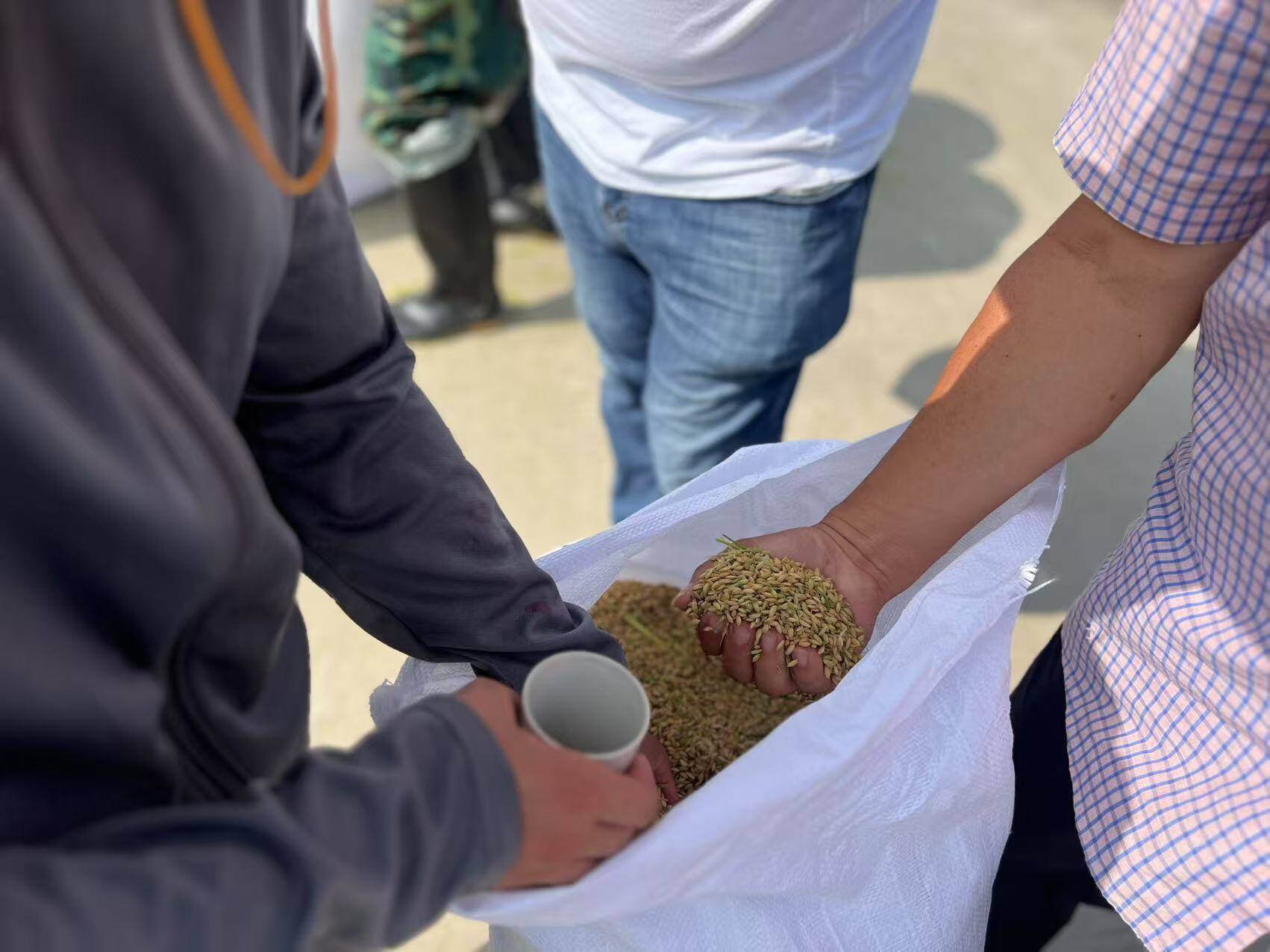 一旁,种粮大户和农场工人正协力将金灿灿的稻谷灌入编织袋,每一次沉甸甸的抬起都引来期待的目光。为确保收割机粮仓内的稻谷全部入袋,郑顺方利落地攀上高大的收割机,用力拉开滚烫的仓门仔细检查:“好了,下一块田。”