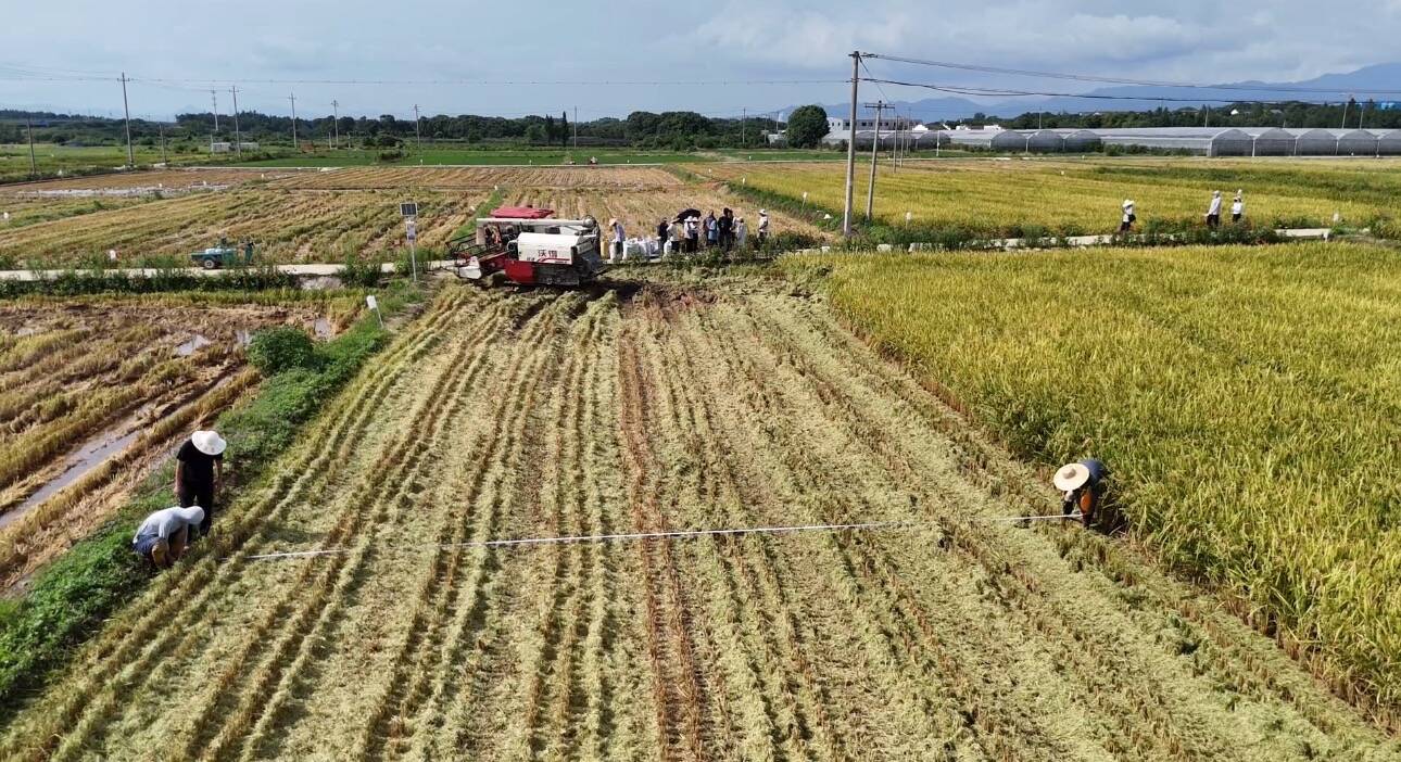 第一块田机收结束,测产组的两名组员拿着卷尺下田,丈量收割田块的宽度。“18.3米!”“18.4米!”“18.8米!”婺城区农业技术推广站的郑顺方声音穿透现场的嘈杂。徐晶晶守在田边,手中的笔在记录本上飞速移动,汗水沿着下巴滴落,洇湿了纸页边缘。“只有精确丈量,才能得到准确数据。”徐晶晶补充道,“我们随机抽取了有代表性的三块田,严格实割测产。”