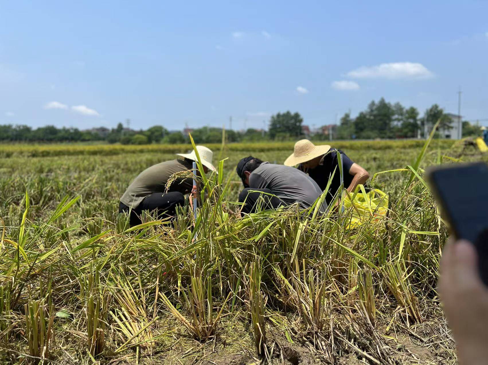 7月14日上午10时,金华开发区罗埠镇花园小妹家庭农场。天空澄澈无云,骄阳似火,将整片稻田炙烤得如一片滚烫的金色海洋,饱满的谷穗谦卑地弯下腰。一群特殊的“农夫”躬身于热浪之中,头顶草帽,脚踩雨靴,有的脖子上还搭着湿毛巾。他们并非收割者,而是市、区两级农业技术专家,粮食丰收最精确的丈量人。