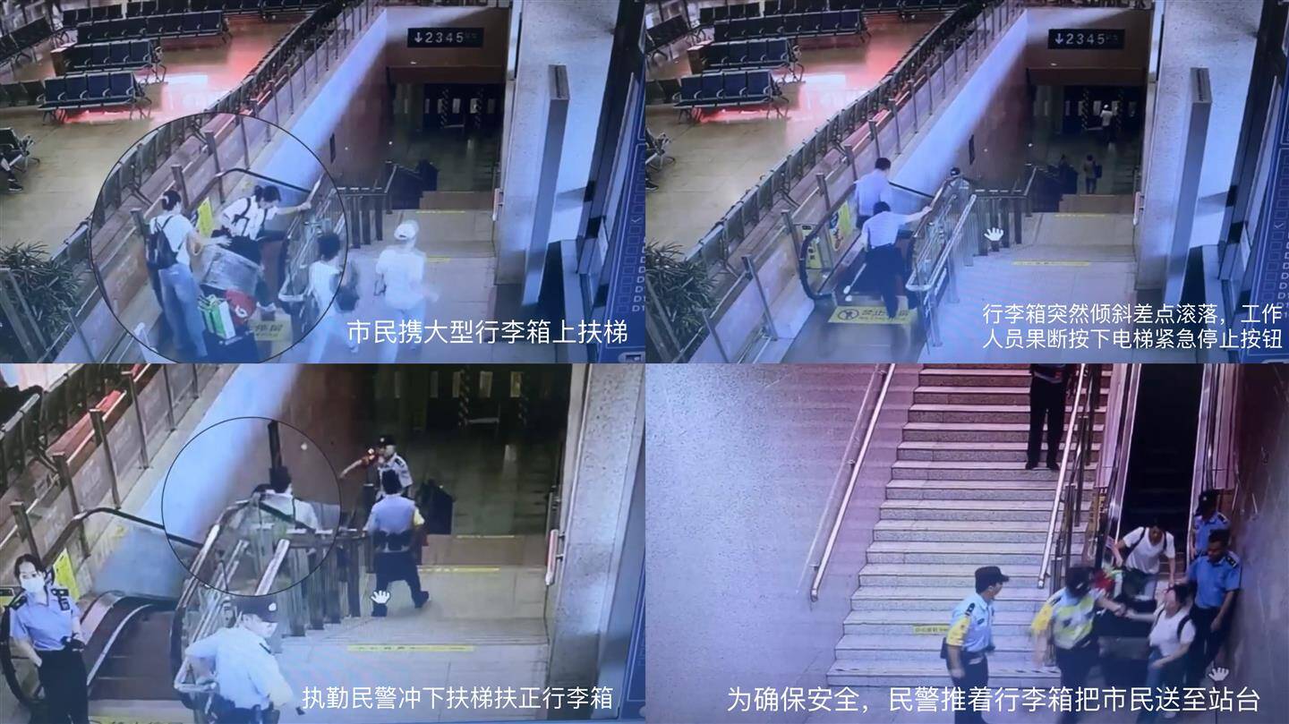 当时,现场车站工作人员发现险情后果断按下紧急停止按钮,扶梯在3秒内平稳停运,正在附近巡逻的永康站派出所值班所长立即带领执勤民警、辅警迅速冲向扶梯,将摇摇欲坠的行李箱扶正。