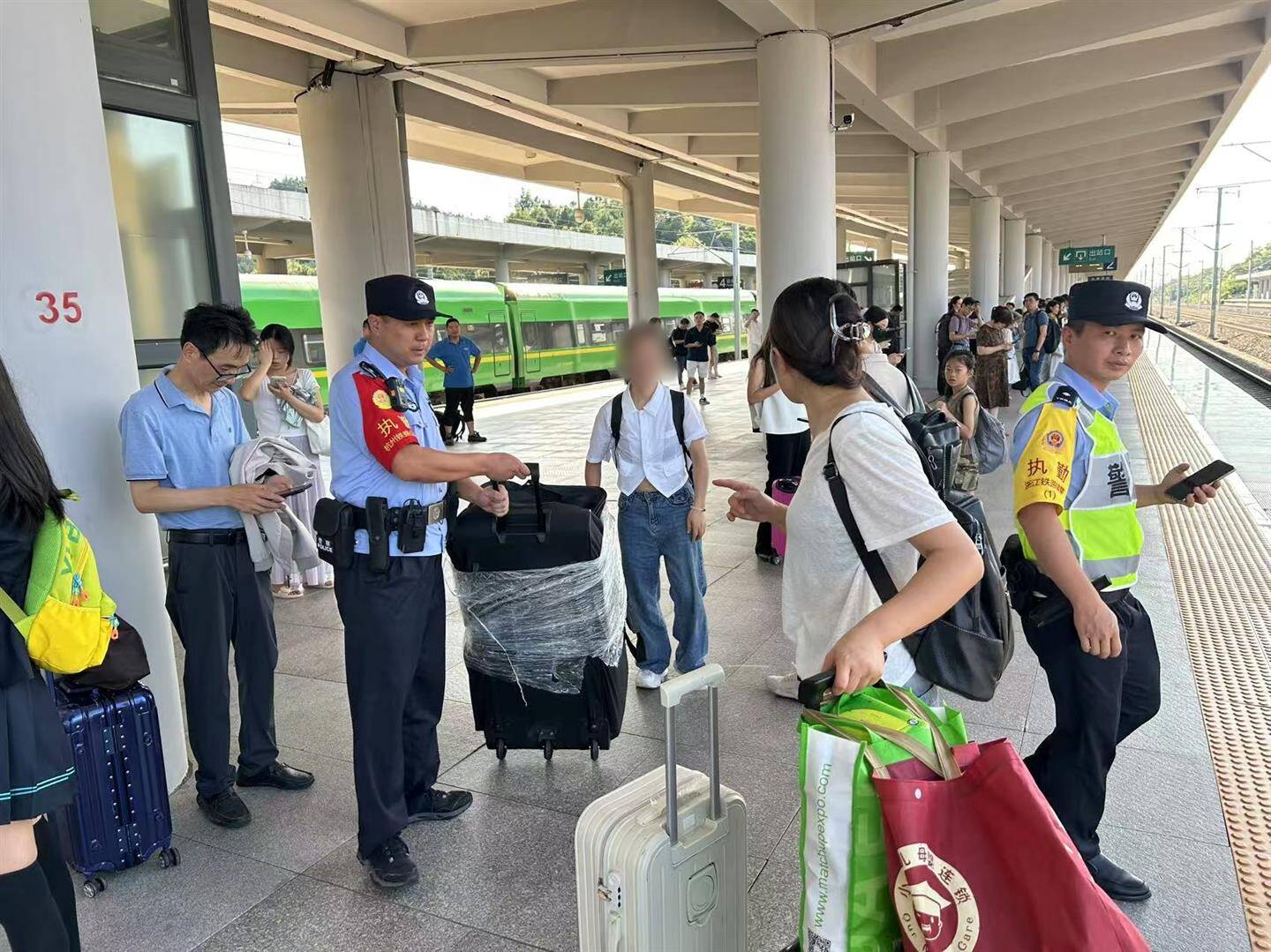 考虑到行李箱重量较大,且胡女士和应女士赶车时间紧张,为确保安全,民警护送她们推动行李箱,并安全送达对应站台。“刚才太惊险了,感谢你们及时出手。”抵达站台后,胡女士、应女士连声道谢。