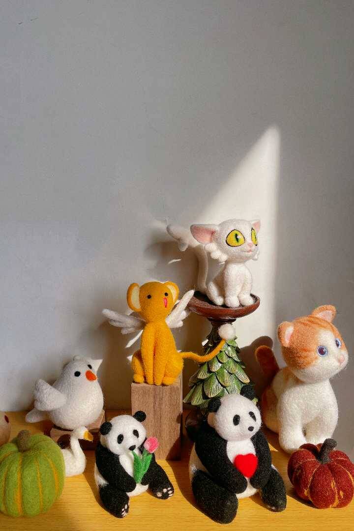 羊毛毡的创作原理简单到近乎原始,就是用戳针反复穿刺羊毛,让纤维慢慢纠缠成型。8月21日,在位于婺城区罗店镇开罗吉市的一家手工店内,记者看到了吴青谕的作品。猫咪、小狗、小蛇、熊猫、飞鸟……这些可爱的小动物形态逼真,色彩的搭配以及小配饰的点缀,为这些羊毛毡雕塑增添了几分趣味和温馨。