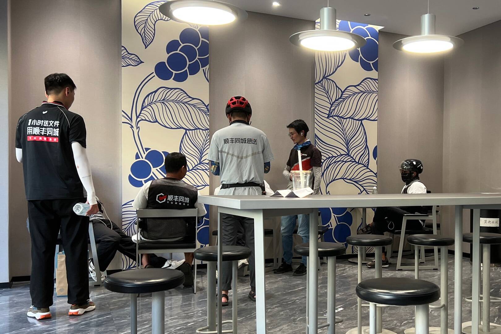 近日,记者在一家咖啡店内看到一幅城市生活微缩景观:一名父亲在耐心辅导孩子写作业,一名白领一边喝果汁一边敲击笔记本电脑,几名快递小哥和两名“红袖章”执勤阿姨在角落小憩喝水,等着取货的外卖小哥趁机休息并给家人打电话……