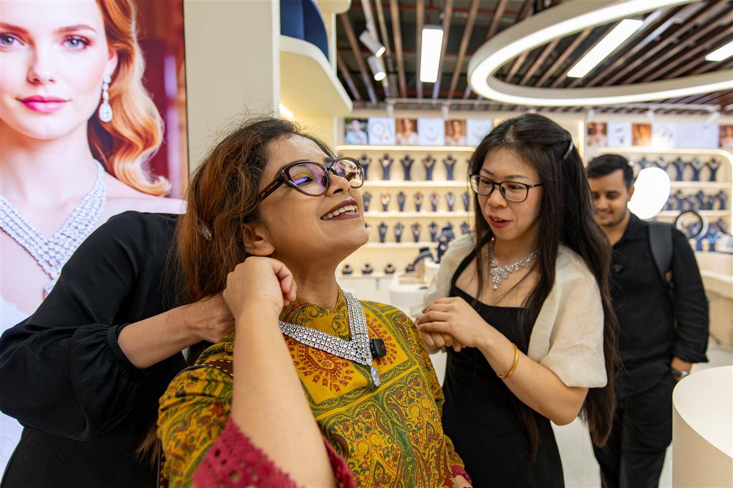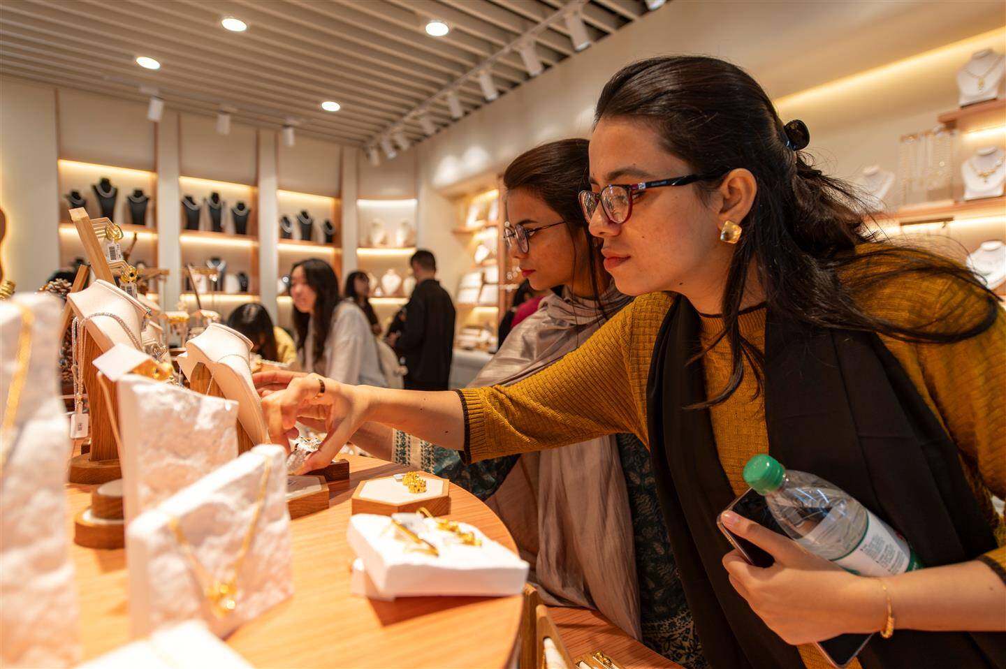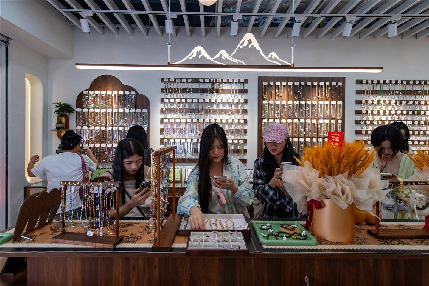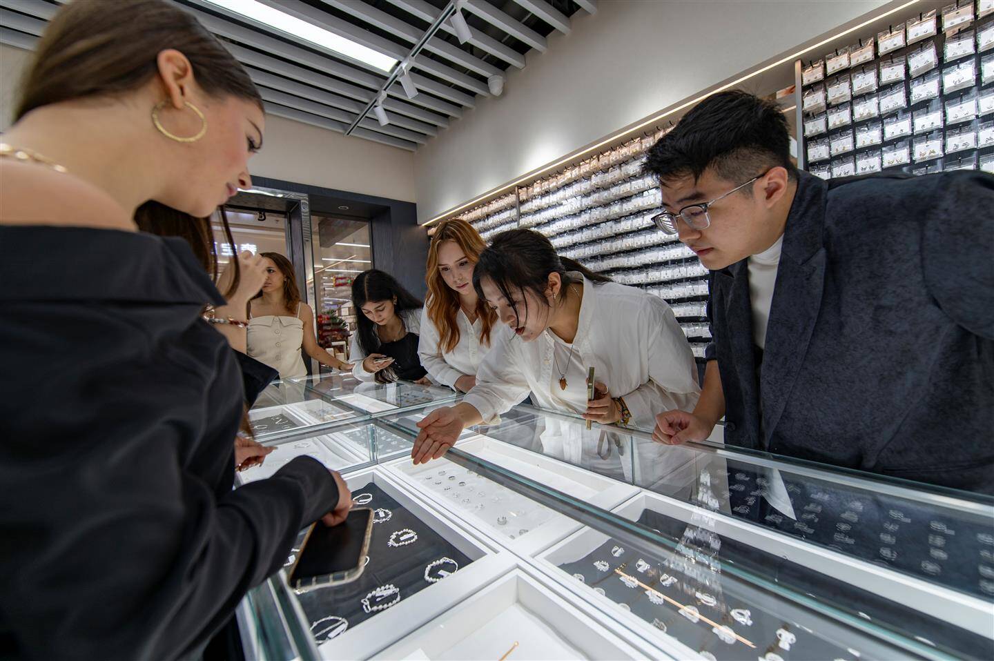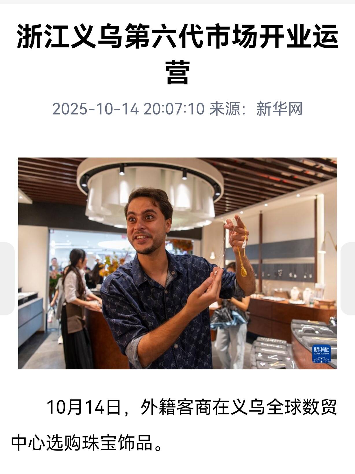 10月14日、10月15日,新华社、新华每日电讯刊发稿件,关注义乌全球数贸中心市场里,国内外客商在选购时尚珠宝饰品。