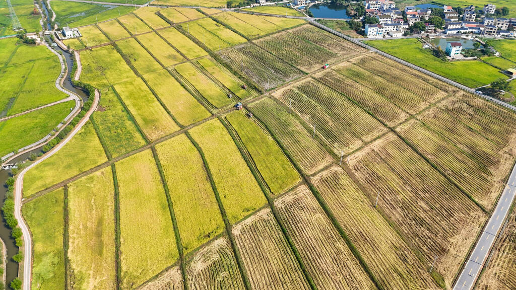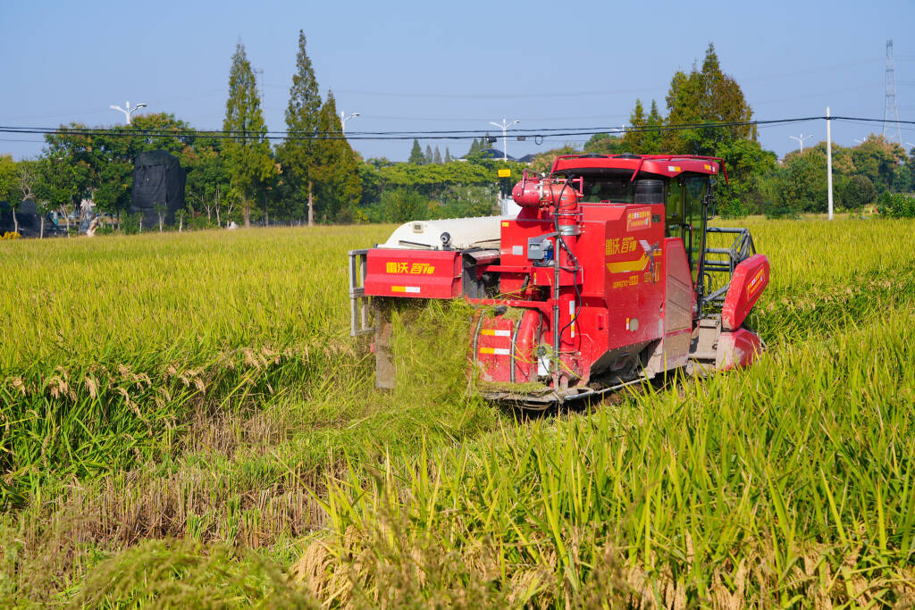 “轰隆——轰隆——”日前,随着第一台联合收割机驶入稻田,秋收大幕正式拉开。笔者在现场看到,4台红白相间的大型收割机在田间往来穿梭,切割台紧贴地面,精准“揽”住每一株稻穗,金黄的稻秆应声倒伏,经脱粒、清选、装袋等工序后,饱满的稻谷顺着输粮管涌入机身粮仓。驾驶员方师傅握着方向盘,目光紧盯仪表盘,不时调整前进速度:“今年稻穗密度大、颗粒饱满,得控制好收割节奏,确保颗粒归仓。”