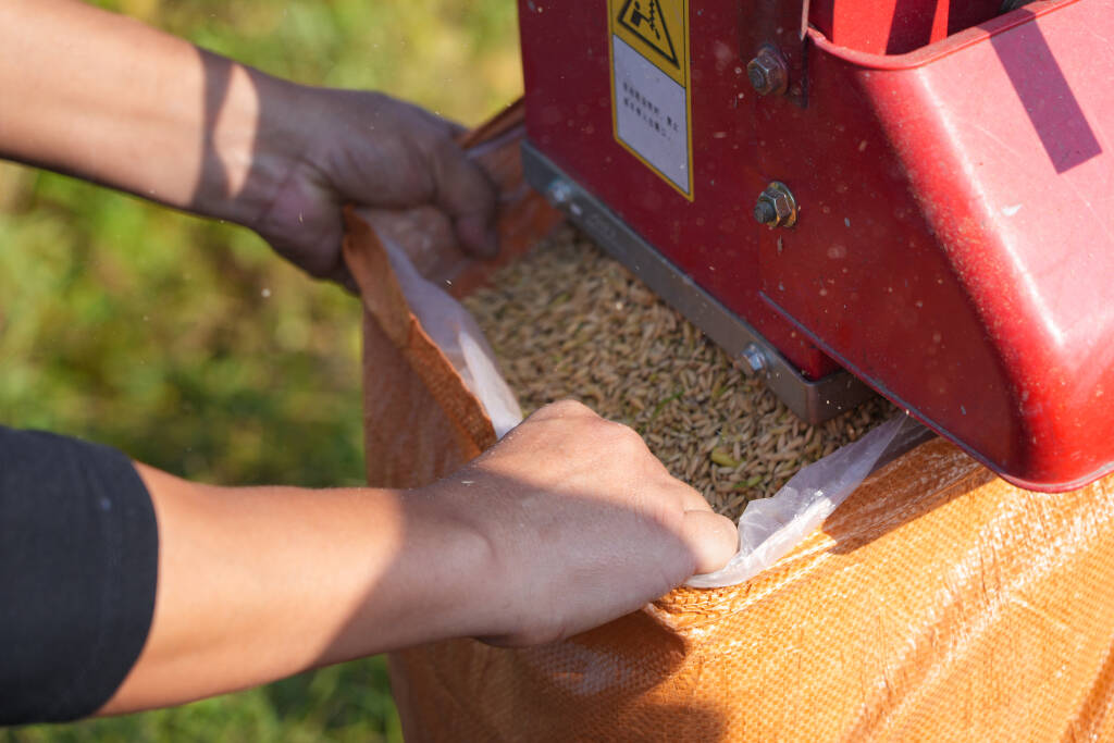 田埂边,万亩区块承包单位的相关工作人员正蹲在田垄上,双手捧起一把刚收割的稻谷。他轻轻搓揉稻壳,圆润的谷粒从指缝滑落,在晨光下闪着油亮的光泽。“你看这稻子,每一粒都沉甸甸的!”他笑着掂了掂手中的稻穗,“今年我们主要种植‘甬优’‘浙科优’等系列优质品种,抗病性强、品质优。”