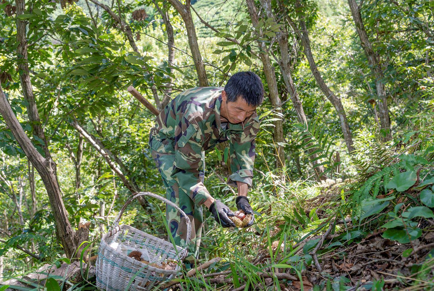 这段时间,婺城区箬阳乡南坑村迎来板栗丰收季,农民邹金朝正在忙着采收。