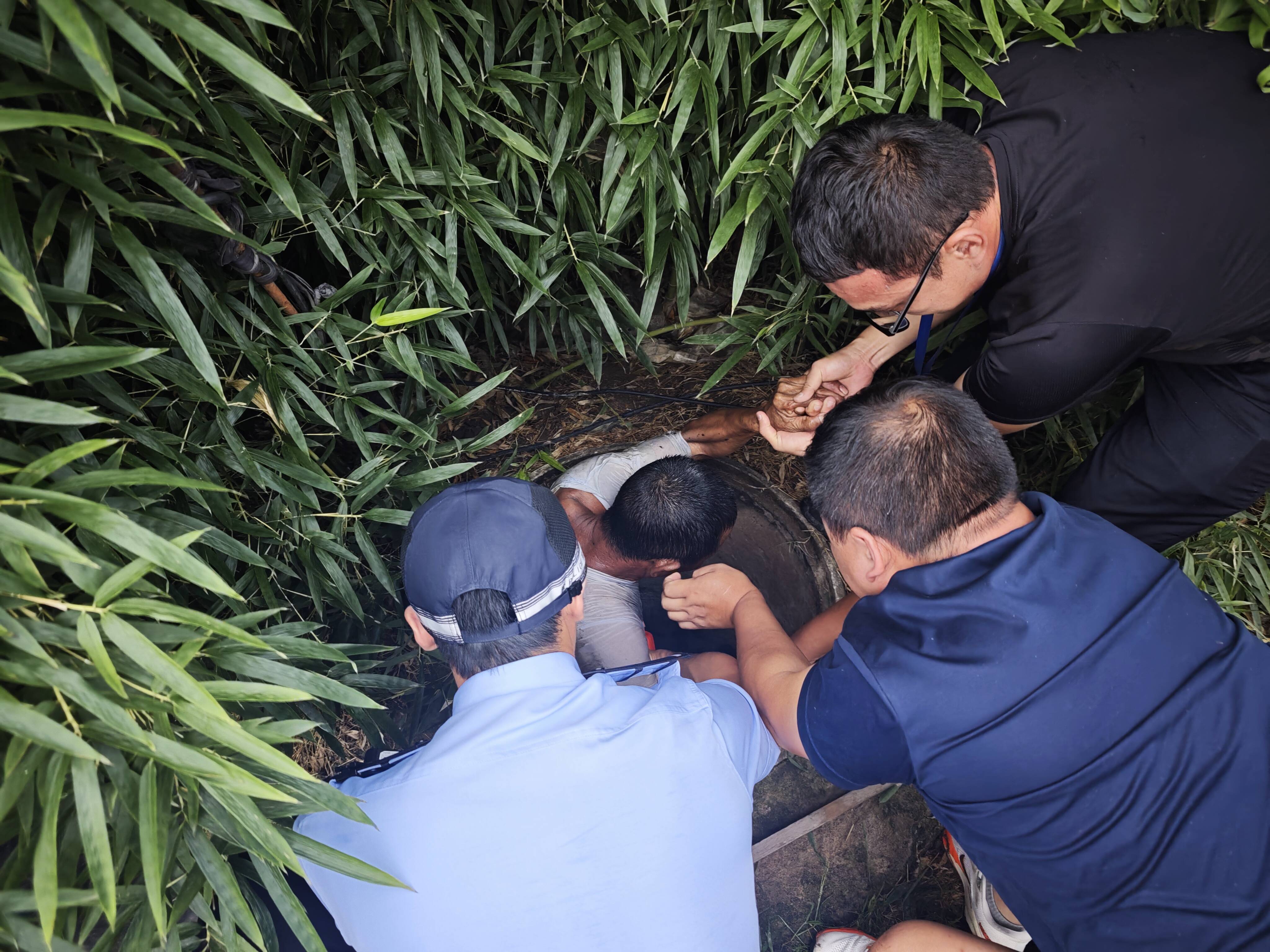 “别怕,我们马上救你上来。”民警一边安抚,一边迅速从警车上取来救生衣和伸缩梯,缓缓将梯子送入井中。井深约莫3米,民警将伸缩梯放入井内,报警人顺着梯子一步步向上攀爬,快到井口时,众人齐伸手,合力将他拉了上来。