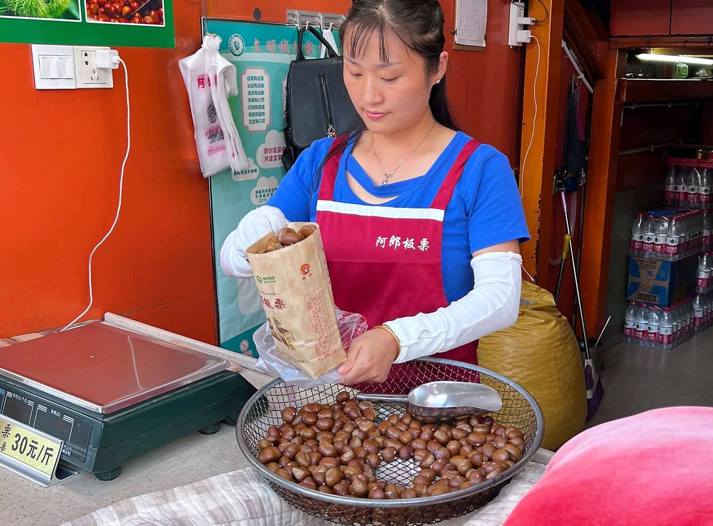 当老街口的瓜子通过物流发往各地时,金华市区解放东路的阿郎板栗店前,早已排起长队。炒板栗机器不停运转,粗砂与板栗在高温下翻滚碰撞,“哗啦哗啦”的声响伴着浓郁香气弥漫街巷。受热膨胀的板栗“砰”地跳出炉口,店员将热气腾腾的栗子倒入铁盆,金黄油亮的模样引得路人驻足。