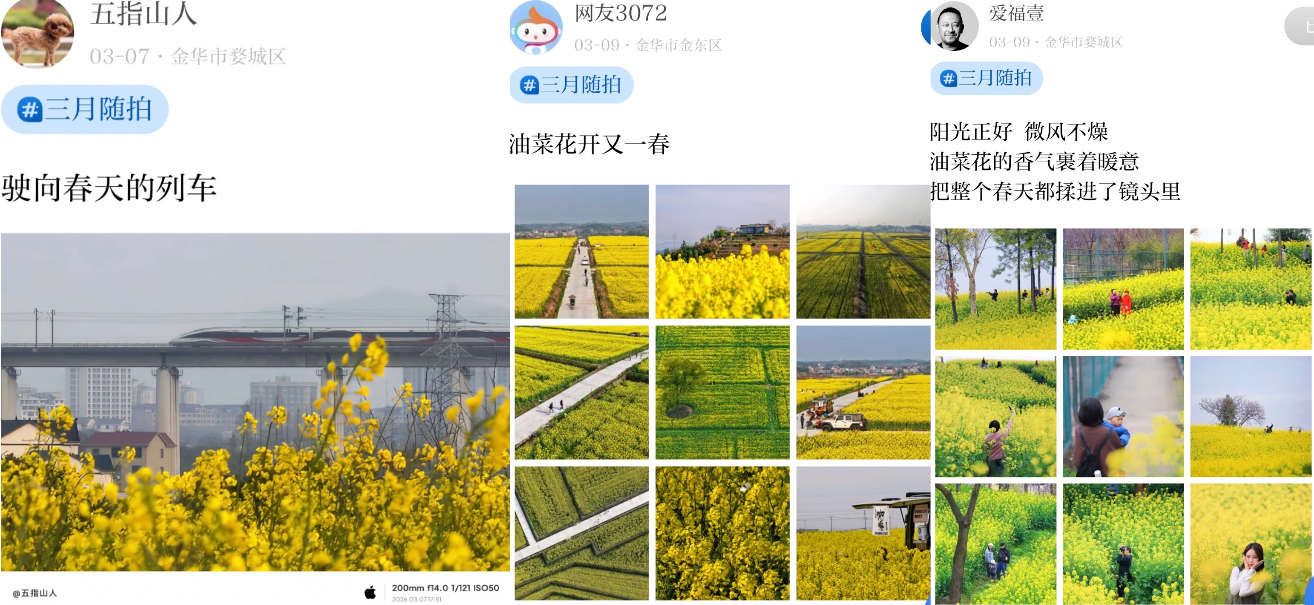 在金彩云聚吧“我是拍客”栏目,已有许多摄影师分享了他们镜头里的金华油菜花。金黄遍野,春光正好,一起来共赏这份限定美好吧!