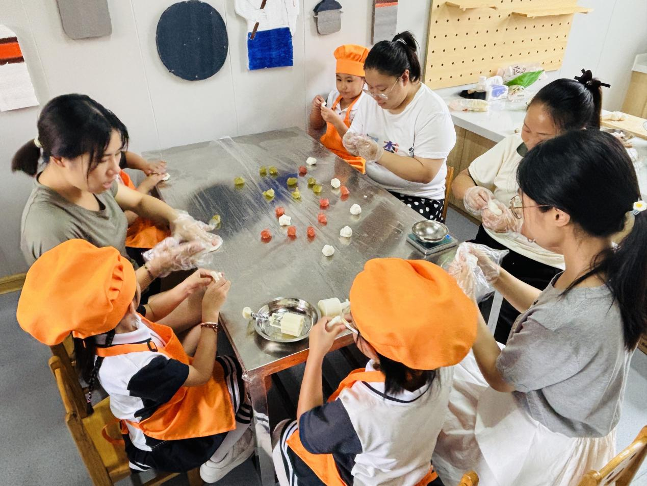 随后,一场温馨欢乐的月饼制作活动拉开帷幕。大家围坐在一起,一同揉面团、包馅料、压模具,每个人都发挥着想象力和创造力,将面团变成了一个个印有兔子、花朵等图案的冰皮月饼。活动现场,欢声笑语不断,在动手制作的过程中,大家都沉浸其中,不仅体验到了劳动的乐趣,更深切地感受到了传统文化的独特魅力。