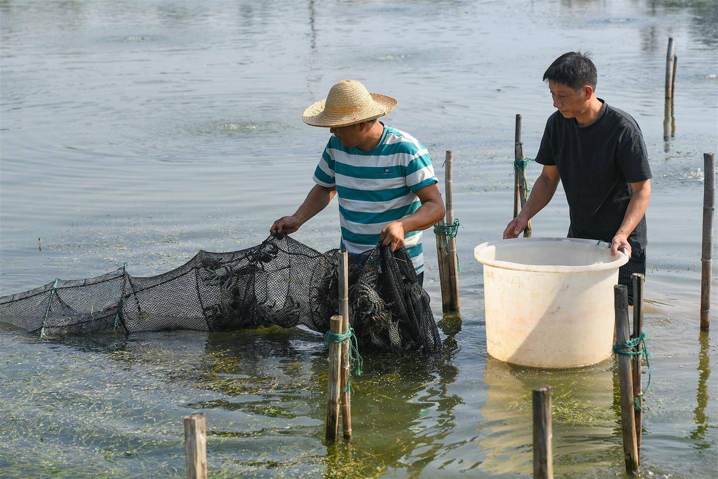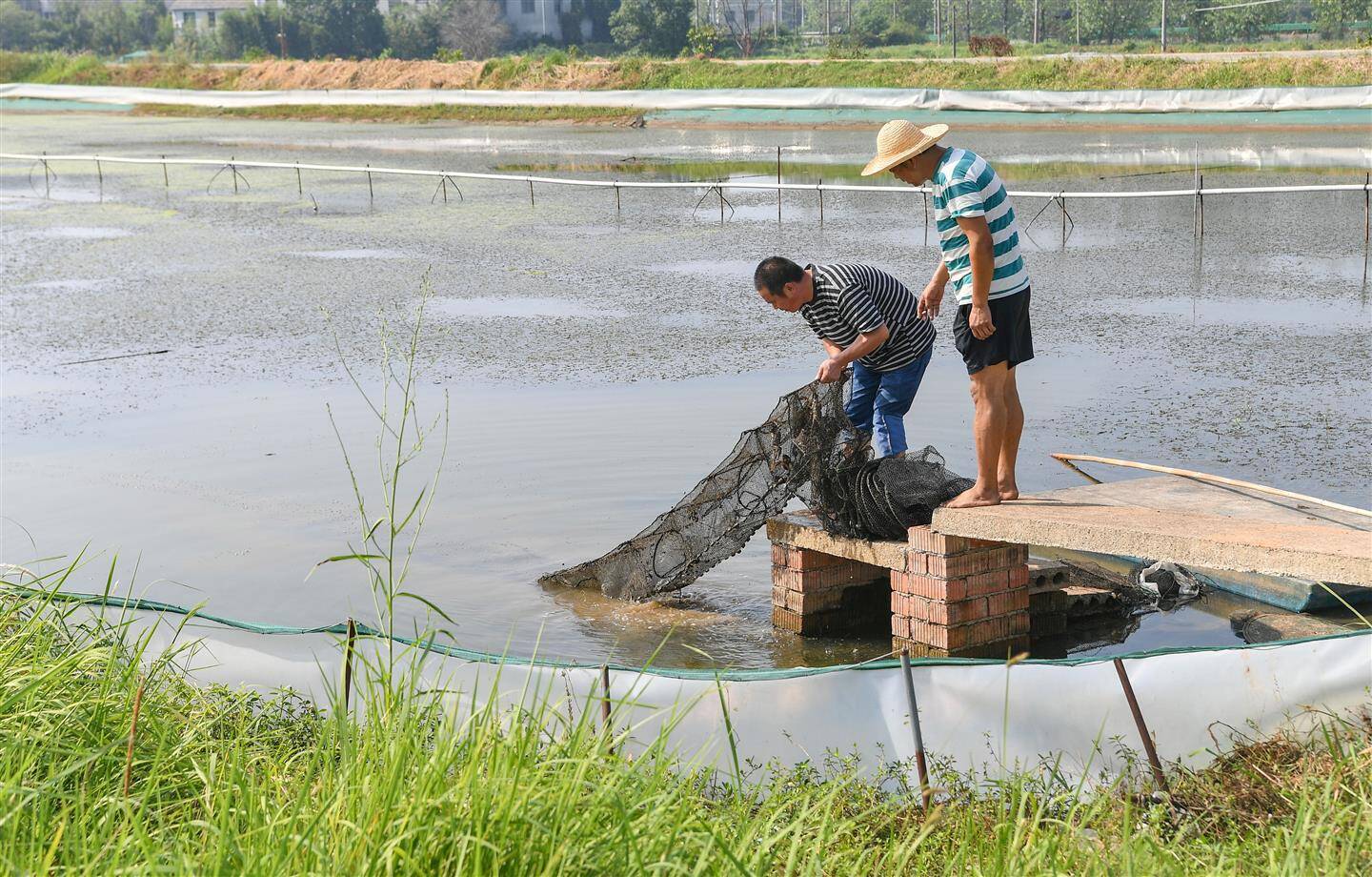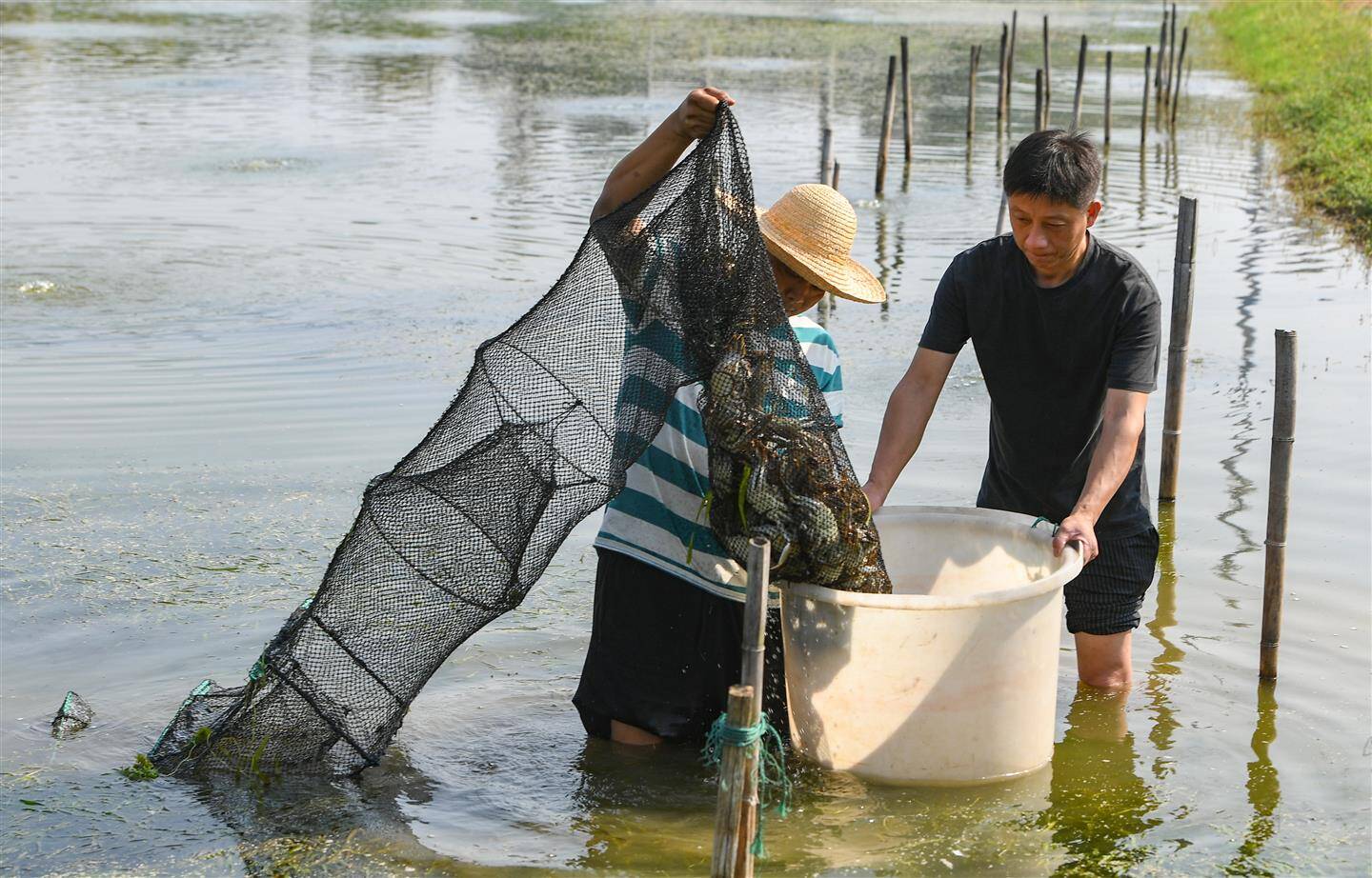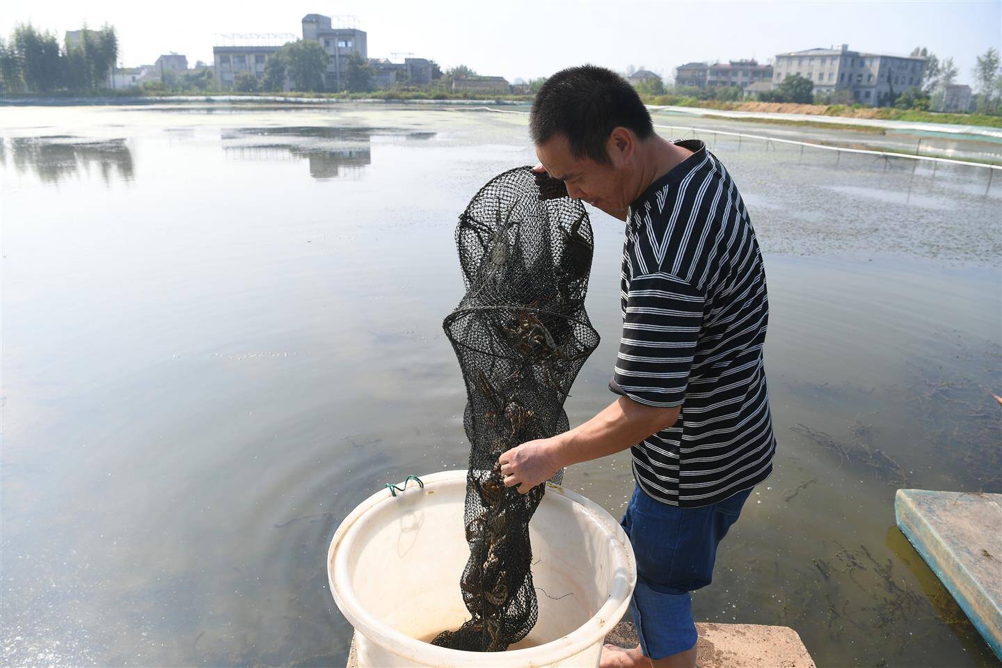 10月13日,在兰溪市永昌街道“李渔家”兰溪蟹养殖基地,村民拉起一只只蟹笼,青壳白肚、金爪黄毛的螃蟹浮出了水面。