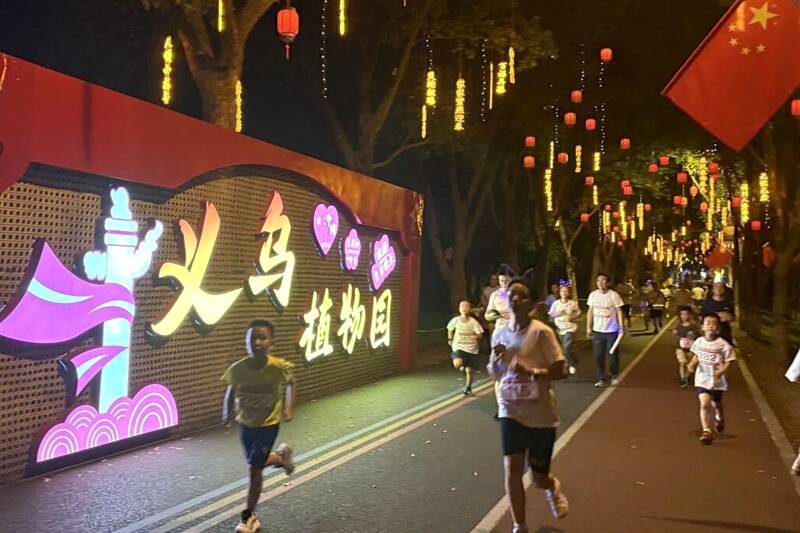 当晚,义乌植物园的夜色被流动的荧光点亮。作为“打开义乌,遇见世界”义乌半程马拉松系列活动,荧光夜跑深度融合全民健身理念,吸引不同年龄段的参与者加入。大家身穿荧光服,手持荧光棒,化身“夜空中的流动星光”,沿着植物园3公里绿道前行。