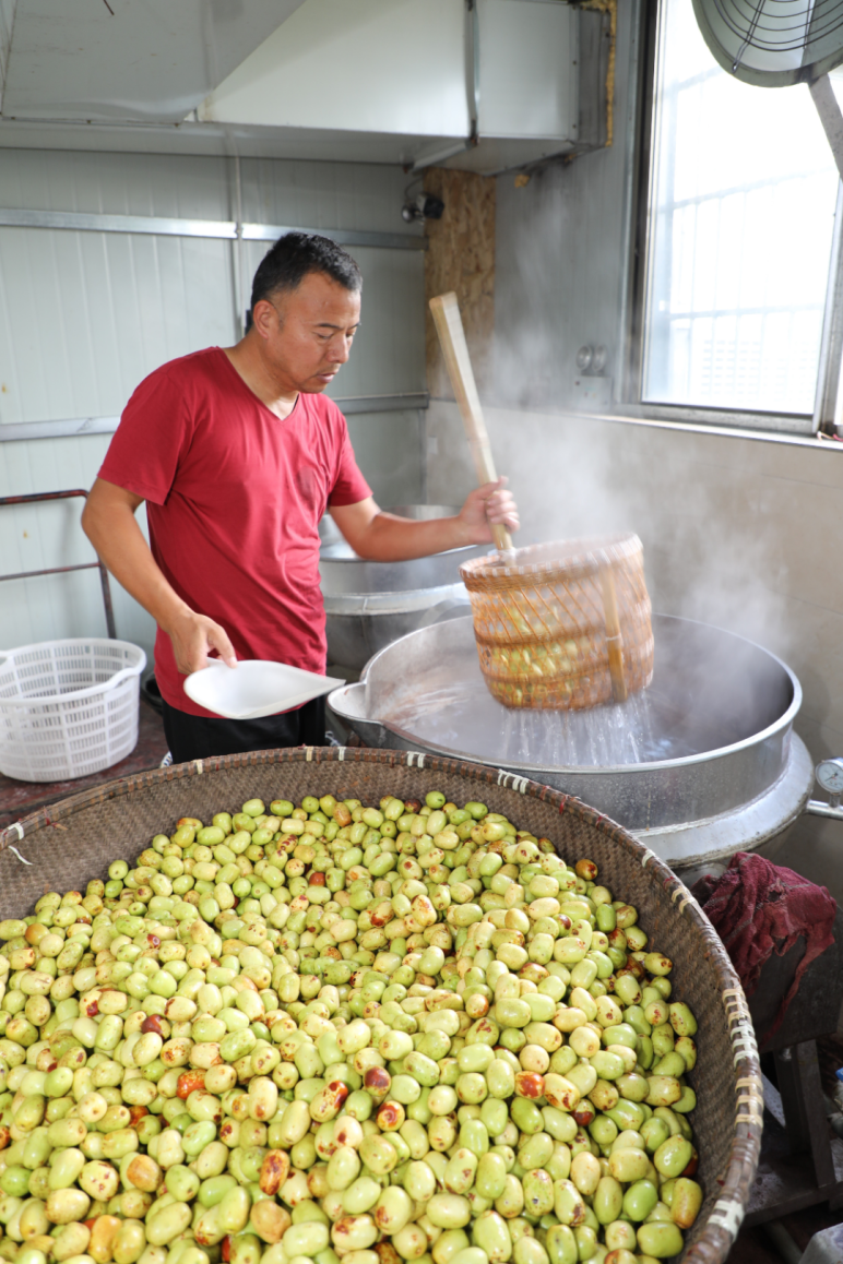 传统的南枣制作,光是工序就有洗枣、烫红、晒红、煮枣、焙烘、再烘等几十道。最考验耐心的是烘焙环节,师傅们要守在烘房里,每隔一段时间就给我们翻面,控制好火候和温度。骆红卫说,他十七八岁就跟着父辈学做南枣,最开始觉得枯燥,后来才明白,这每一道工序里都藏着“枣的脾气”——比如烫红时,水温必须卡在90度,浸烫一两秒就得捞出来,不然就会破坏我们的“皮肤”;焙烘时,温度高了会焦,低了又晒不干,全靠师傅的手感和经验。