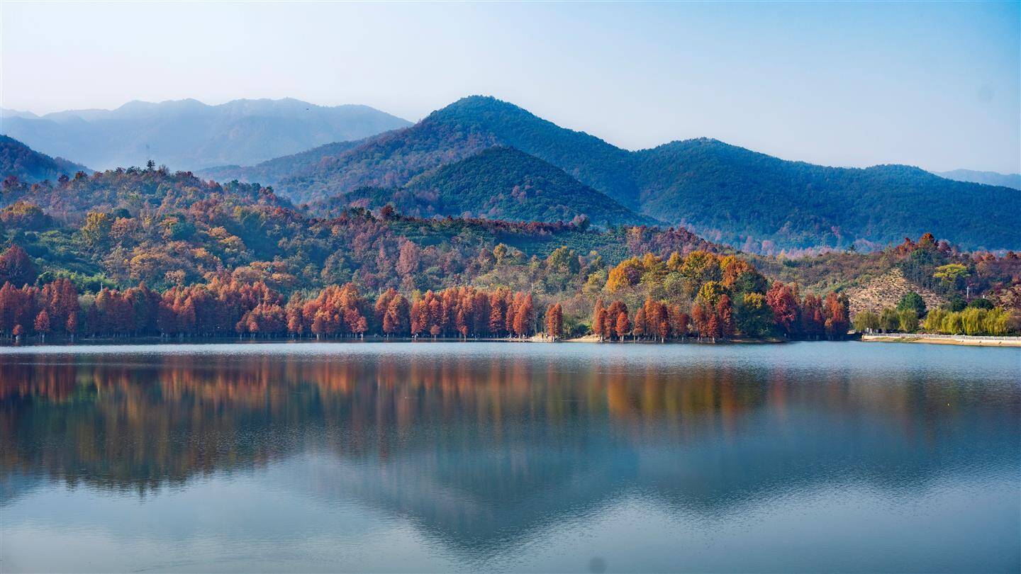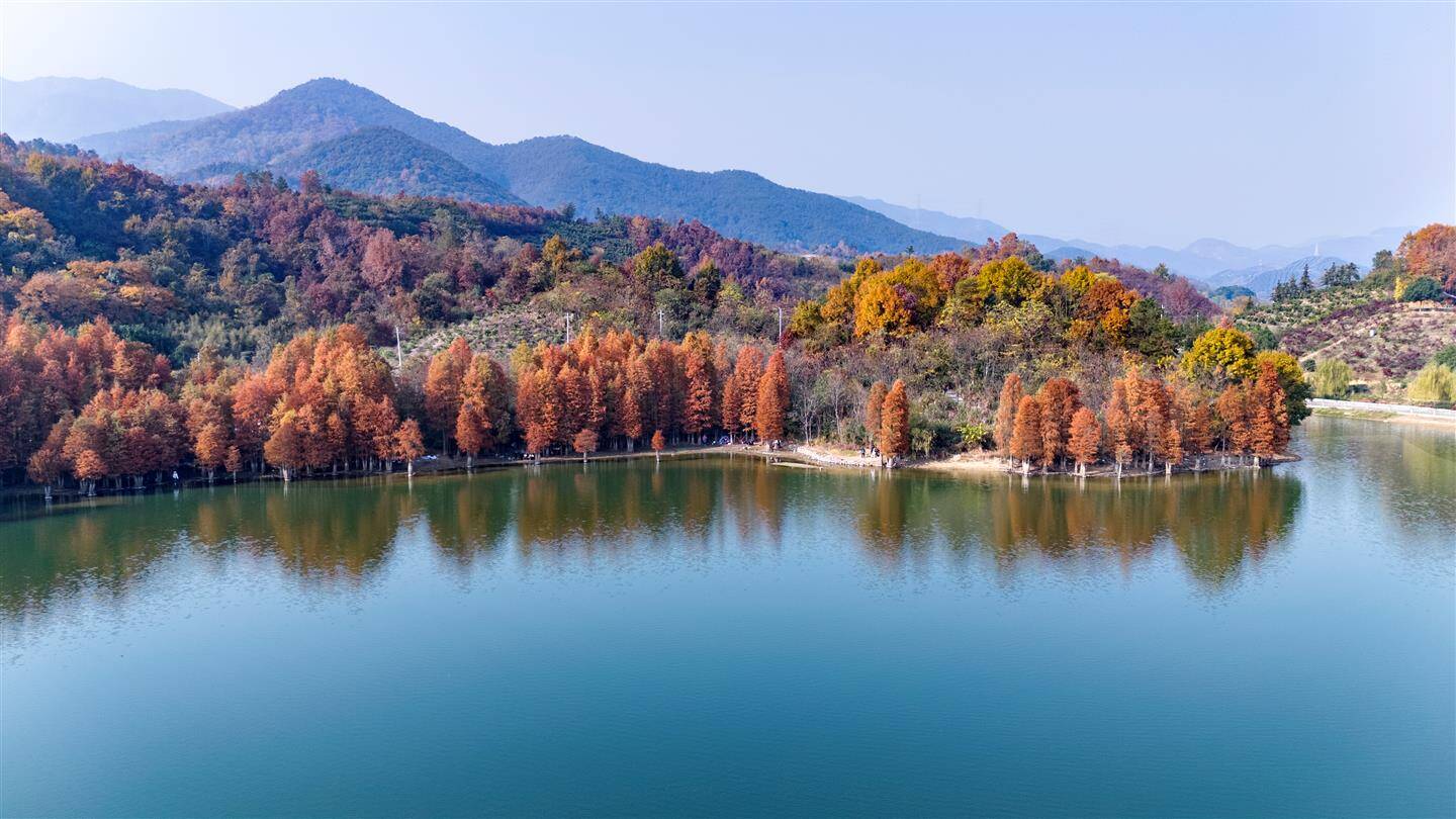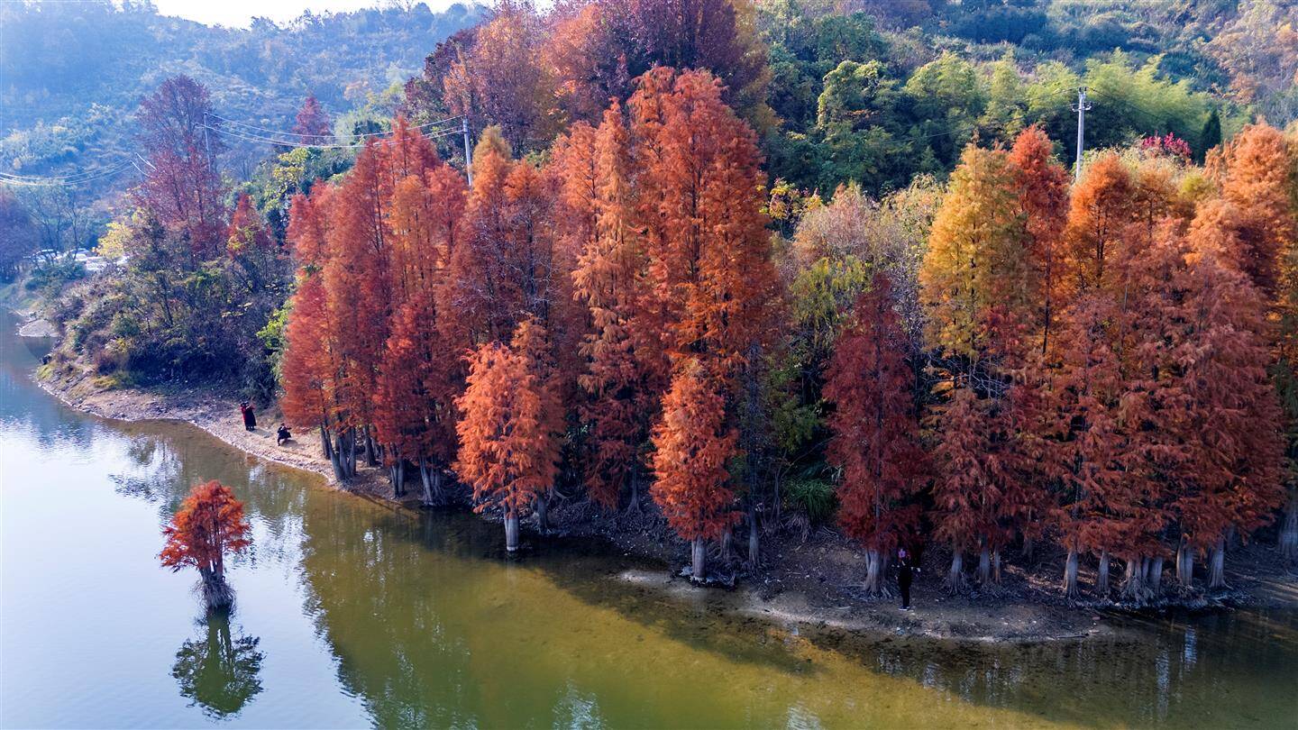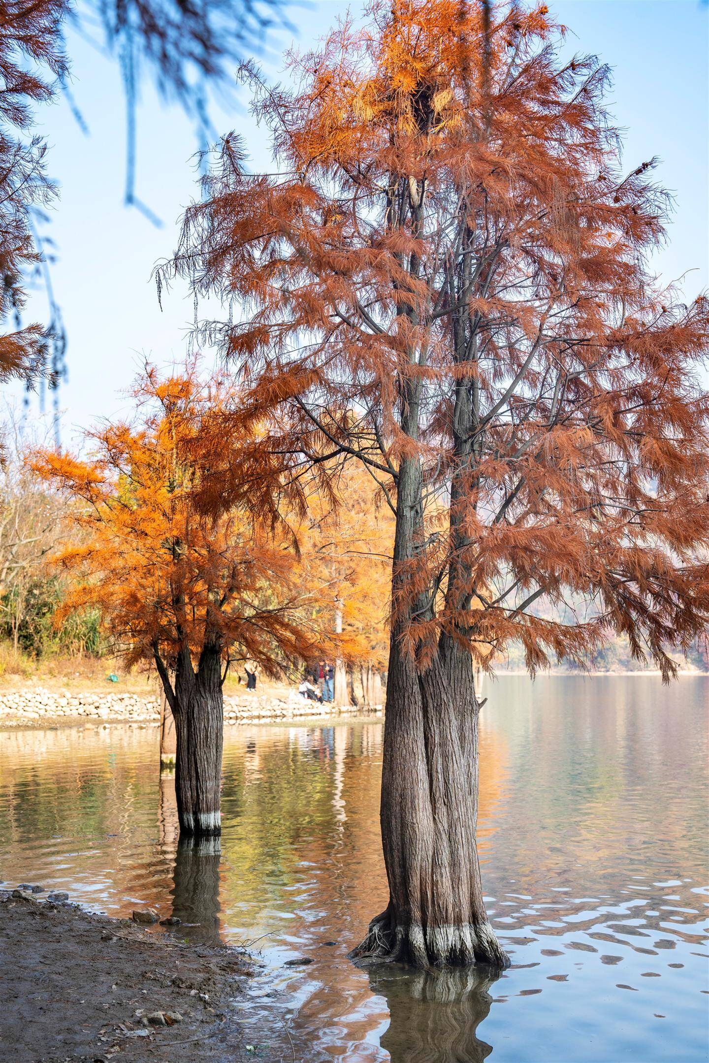 入冬后,水杉便陆续呈现出金黄、橘红等不同颜色,日前,曹宅镇麻堰水库旁的水杉林迎来一年中最绚烂时刻。
