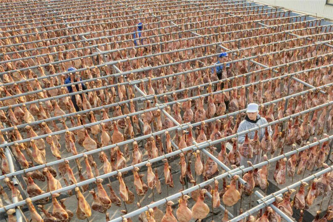 数万条琵琶火腿齐晒“日光浴” 金华火腿进入制作旺季
