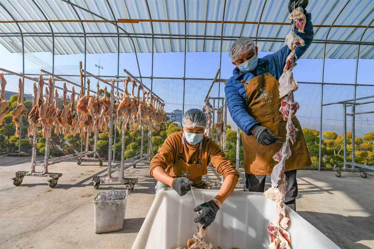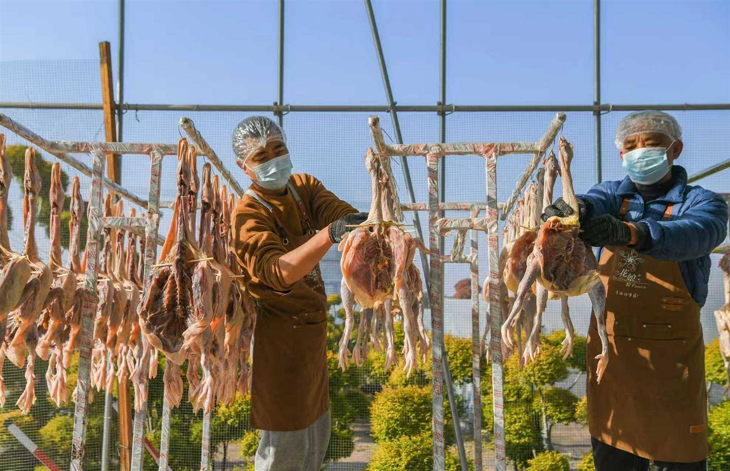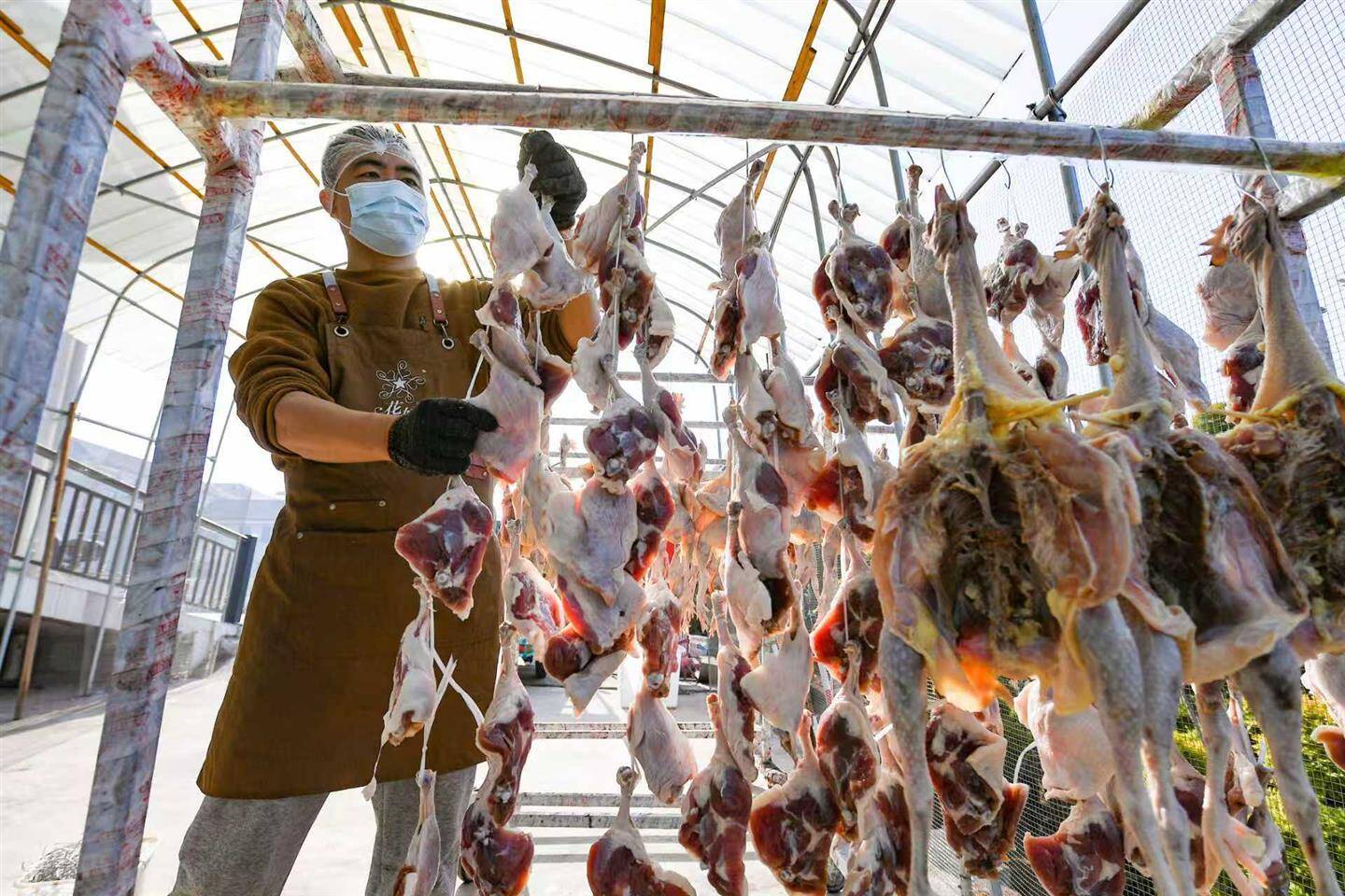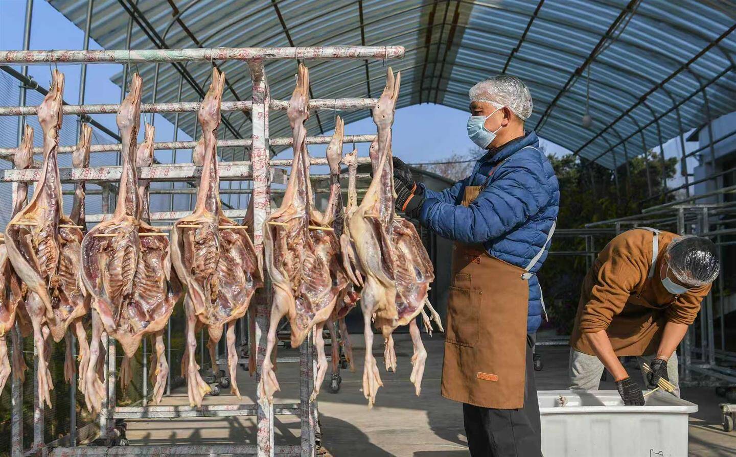 近期持续晴朗、气温适宜,正是制作腊味的好时机。新鲜的鸡鸭经过清洗、腌制后,需在充足的阳光下晾晒20余天,达到六七成干,方能制成风味地道的腊味。在阳光大棚中集中晾晒,能有效起到防尘、防虫的作用。