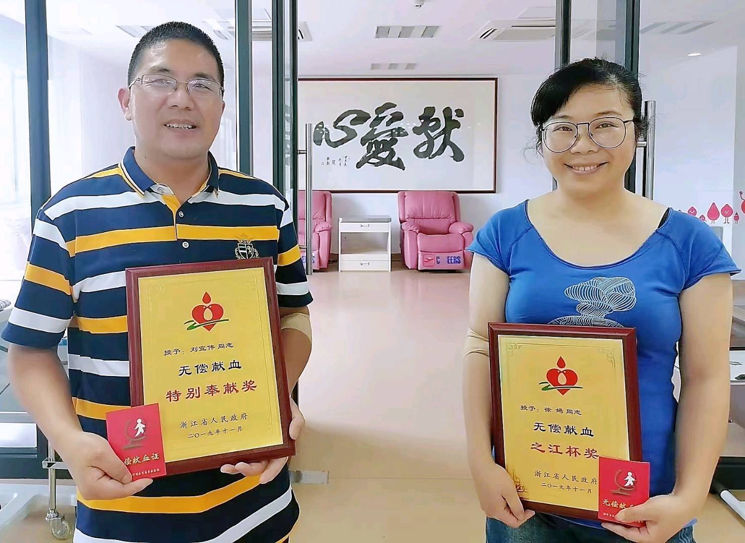 妻子徐嫣也是一名医务人员,“起初看着他每月奔波献血,特别是有时候,他工作很忙、很累,还坚持献血时,我既佩服他,又心疼他。”徐嫣告诉记者,对于丈夫献血,她全力支持。在丈夫的影响下,她也成为了无偿献血的“常客”。截至目前,徐嫣累计献血130次,献血量达4.65万毫升,夫妻俩还多次一起站上领奖台,国家级无偿献血奉献奖金奖、浙江省无偿献血之江杯奖的奖杯,被他们整齐地摆放在家里书柜的最显眼处,“这是我们家最珍贵的‘军功章’。”