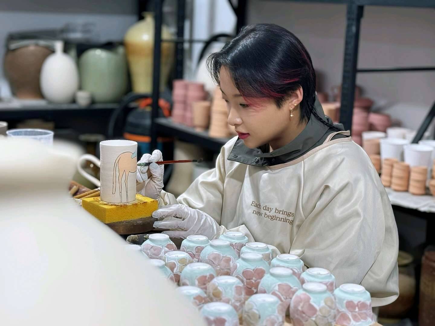 走进她的工作室,传统青瓷茶器透着古窑温润质感,萌趣咖啡杯上的小猫、小兔纹样灵动可爱,既留存婺州窑的古法韵味,又注入青春潮流元素,精准戳中年轻人的审美喜好。
